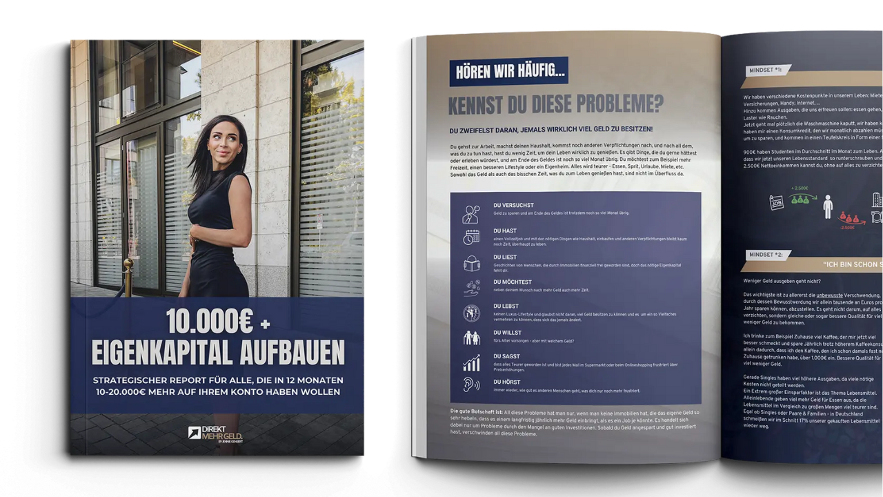 Bei unserem Direkt-mehr-Geld-System lernst du, wie du am Monatsende mehr Geld übrig hast, jedes Jahr Eigenkapital aufbaust und dein Alltag entspannter wird. Ursprünglich wurde dieses System für unsere Immobilienkunden entwickelt, um ihnen beim weiteren Aufbau von Eigenkapital zu helfen. Aufgrund der hohen Nachfrage, bieten wir es nun mitlerweile seperat an, für diejenigen, die in Immobilien investieren wollen, allerdings nicht genügend Eigenkapital besitzen.